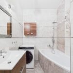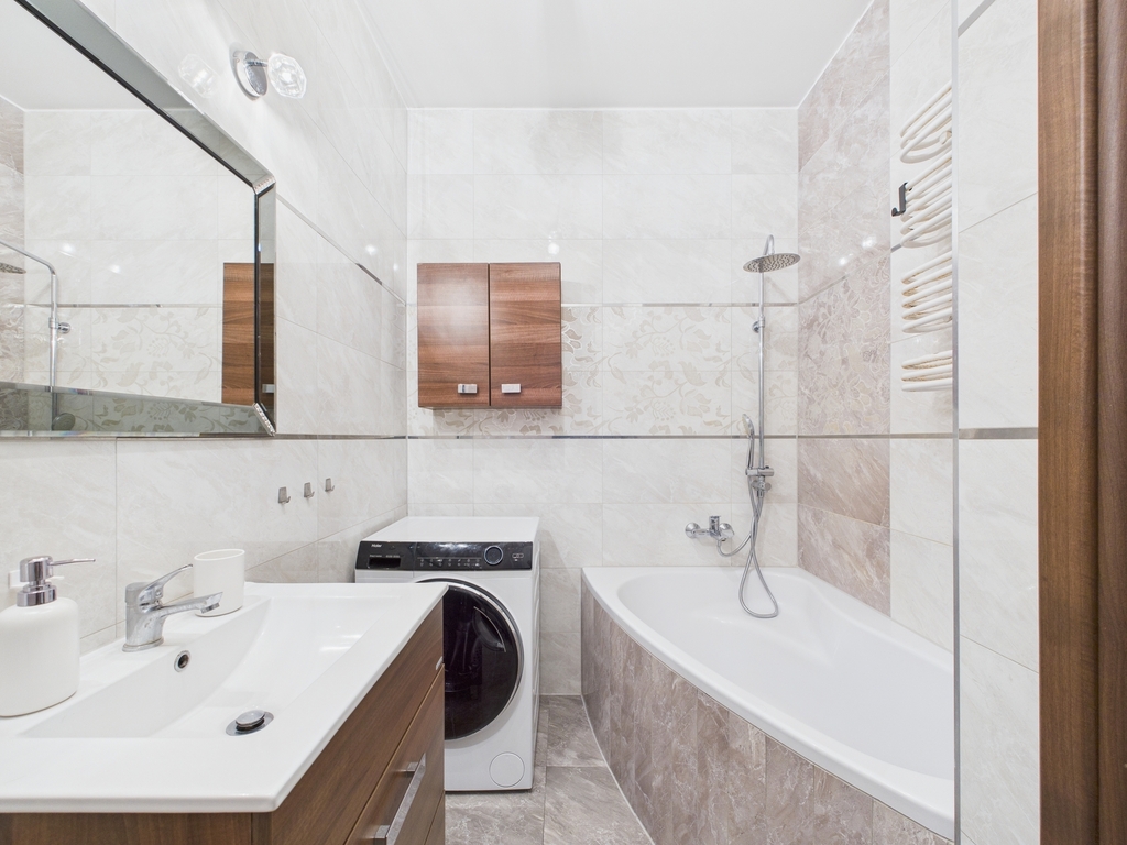 - Łazienka z narożną wanną, deszczownicą oraz pralką