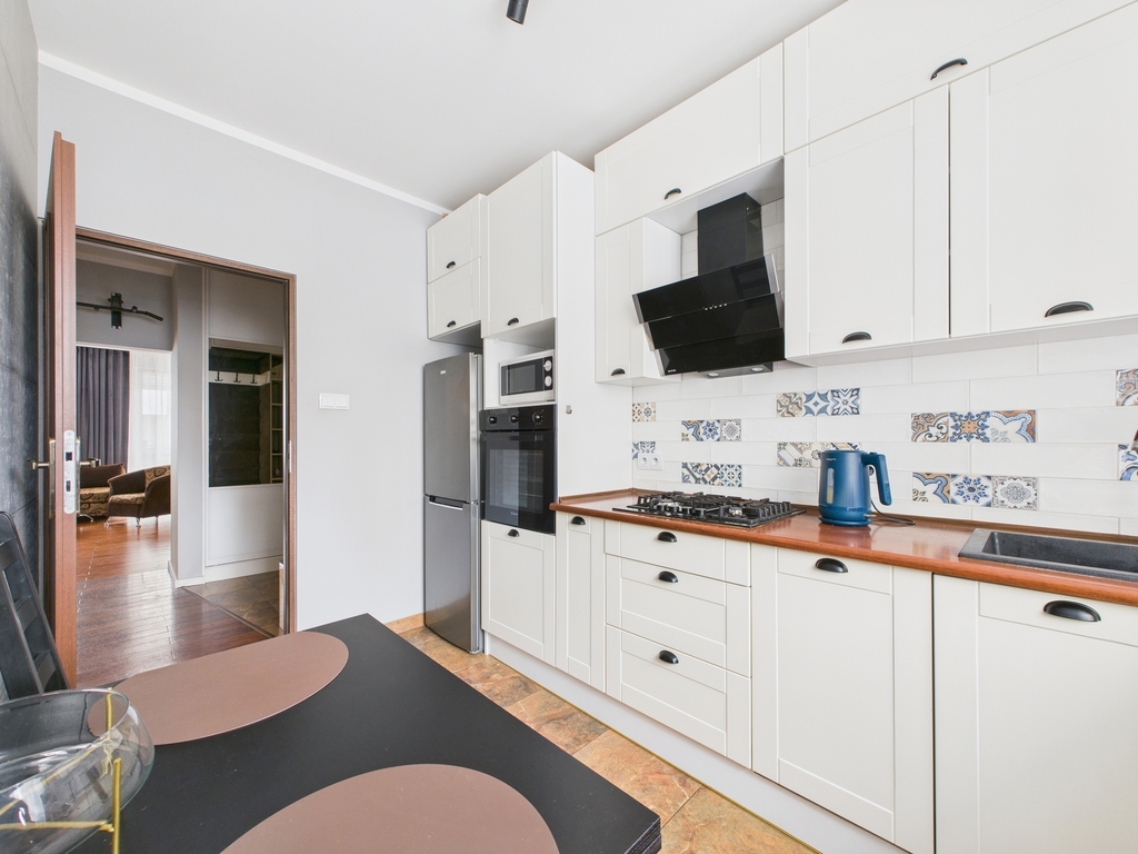 - Widna, oddzielna kuchnia – w pełni wyposażona (lodówka, piekarnik, kuchenka gazowa, okap, zmywarka), z wygodnym miejscem do spożywania posiłków