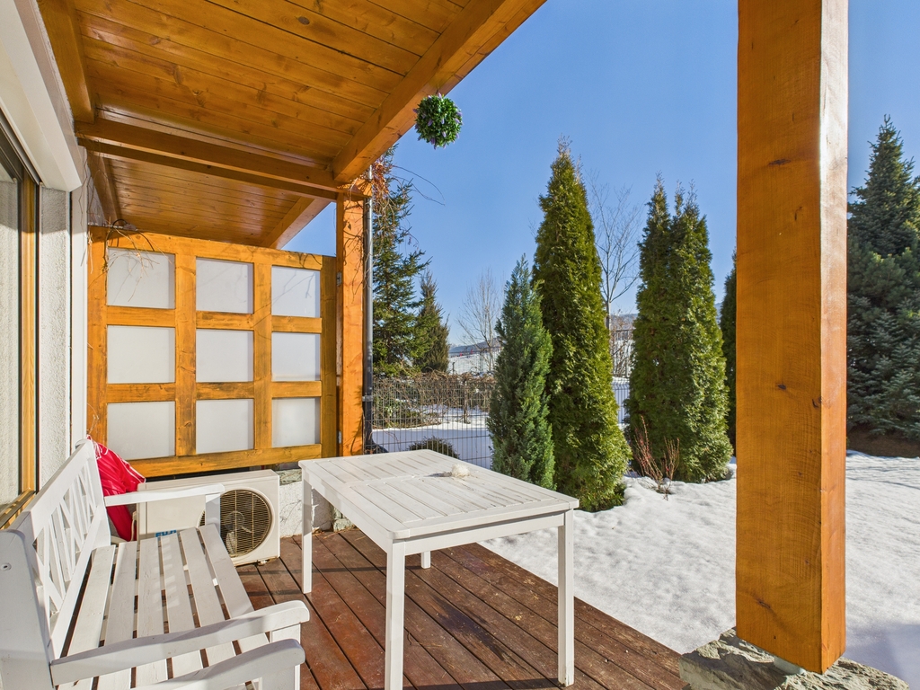 Apartament o powierzchni 52,63 m² z prywatnym ogródkiem o powierzchni ok. 70 m² oraz widokiem na Giewont. Wnętrze wykończone w stylu zakopiańskim – drewniane podłogi oraz elementy z naturalnego drewna, wykonane na zamówienie przez lokalnego artystę, Pana Giewonta, nadają całości wyjątkowy, regionalny charakter.