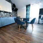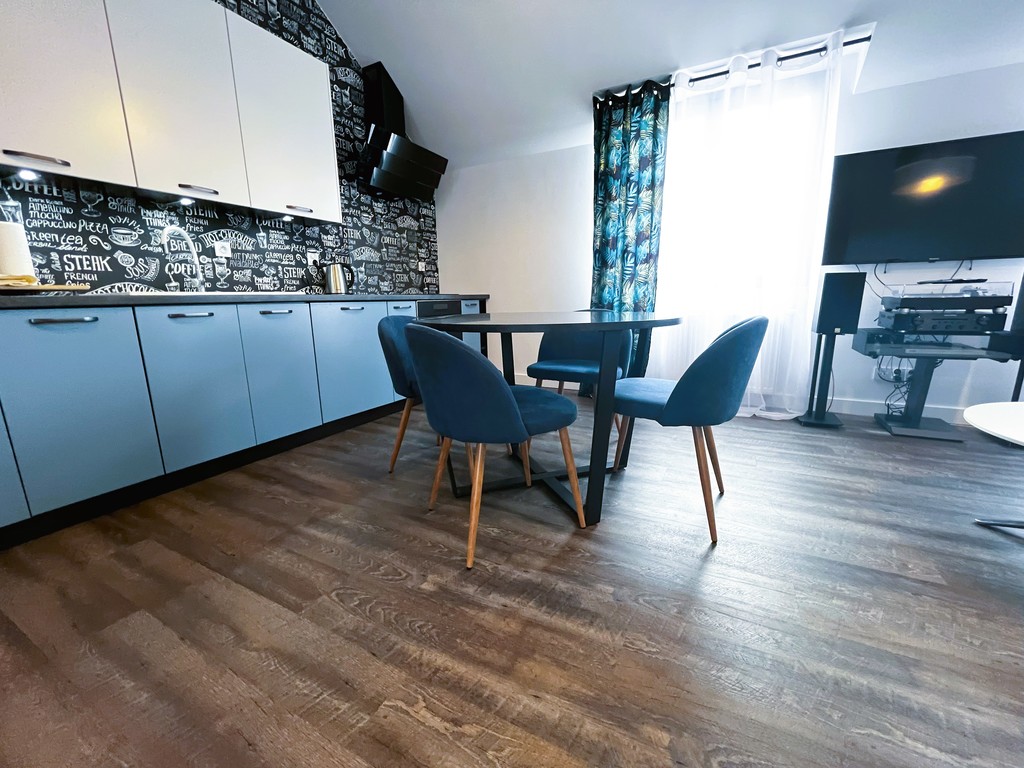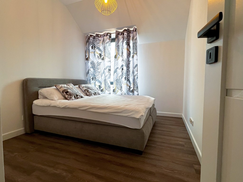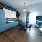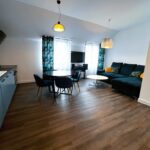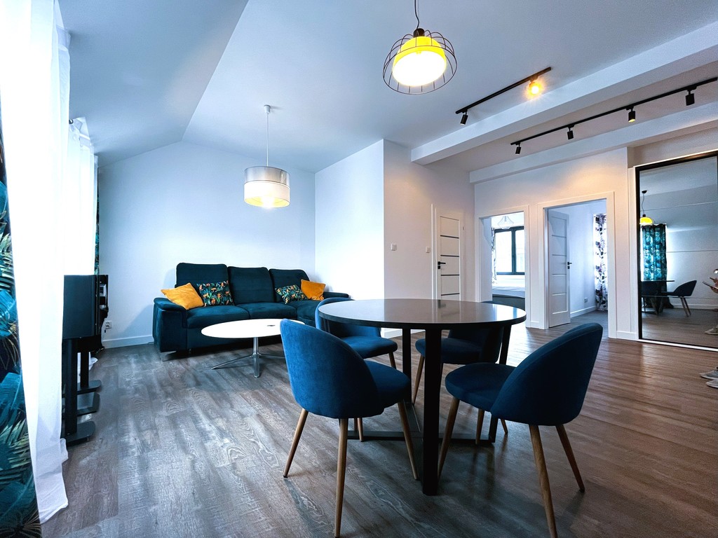 - Kuchnia: Płyta indukcyjna, piekarnik, zmywarka, lodówka z zamrażarką, okap kuchenny, podstawowe naczynia i sztućce.