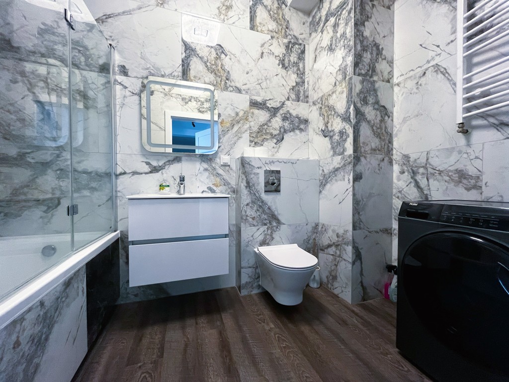 - Łazienka: Pralko-suszarka, wanna ze ścianką prysznicową, sterowanie światłem SmartLed