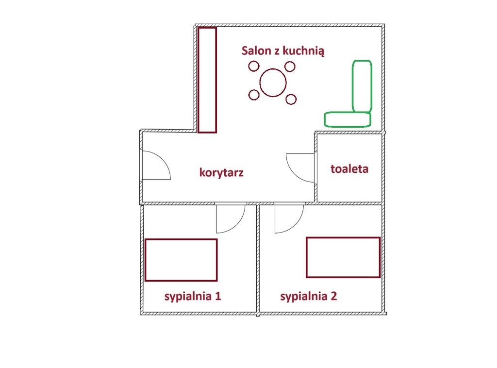 - Salon: Zestaw telewizyjny wraz z zestawem głośników, wygodna kanapa, szafa w zabudowie.