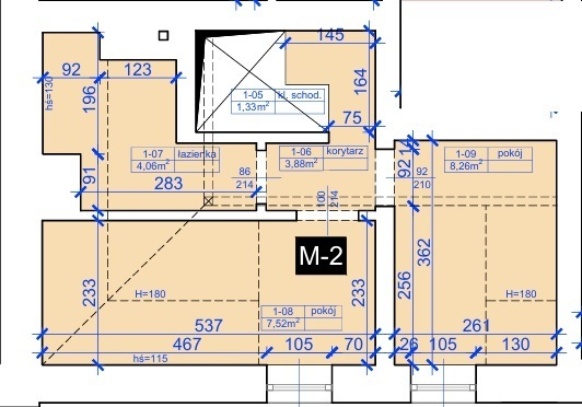 - korytarz na dwóch poziomach, który łączy się klatką schodową (łącznie 9 m2)