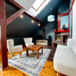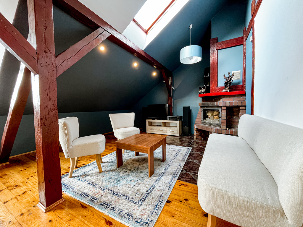 • przestronny salon z kominkiem, TV i zestawem wypoczynkowym