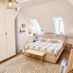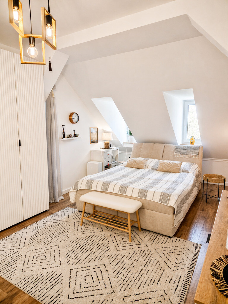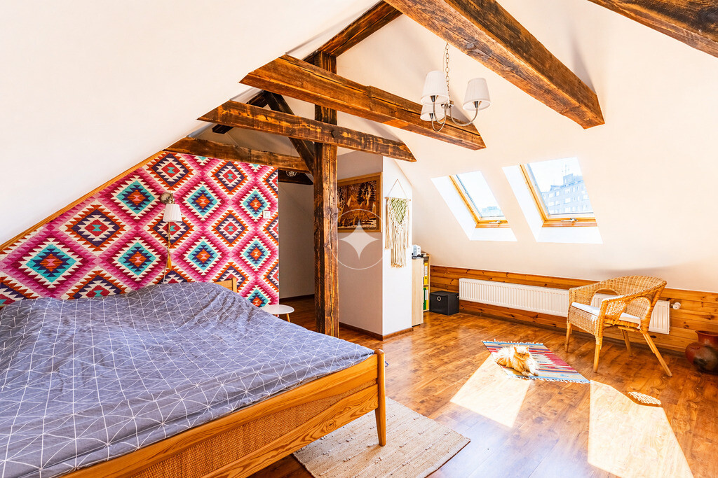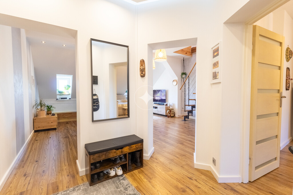 Mieszkanie o powierzchni 62,18 m² zostało powiększone o dodatkowe pomieszczenie 16,60 m² (zaadaptowane na sypialnię), co daje wyjątkową przestrzeń do życia w układzie dwupoziomowym. Mieszkanie oferuje znacznie większą przestrzeń niż wynika to z metrażu – dzięki powierzchni pod skosami zyskujemy dodatkową przestrzeń, wysokości poniżej 1,40m nie wlicza się do metrażu użytkowego.