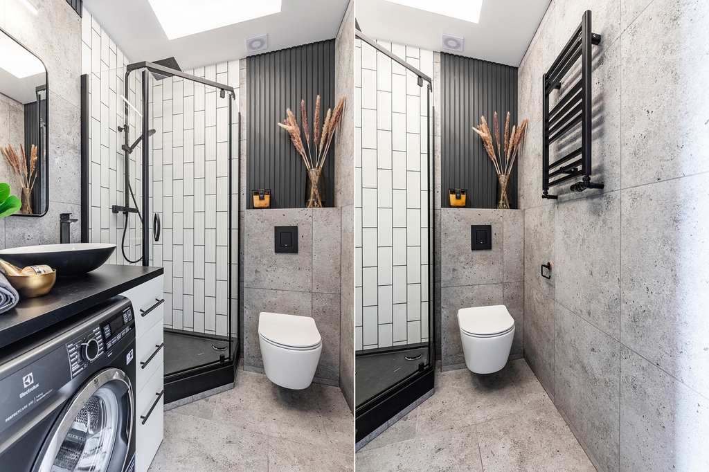 - komfortowej, nowocześnie urządzonej ŁAZIENKI – 3,7 m² z pełnym wyposażeniem sanitarnym i nową pralką,