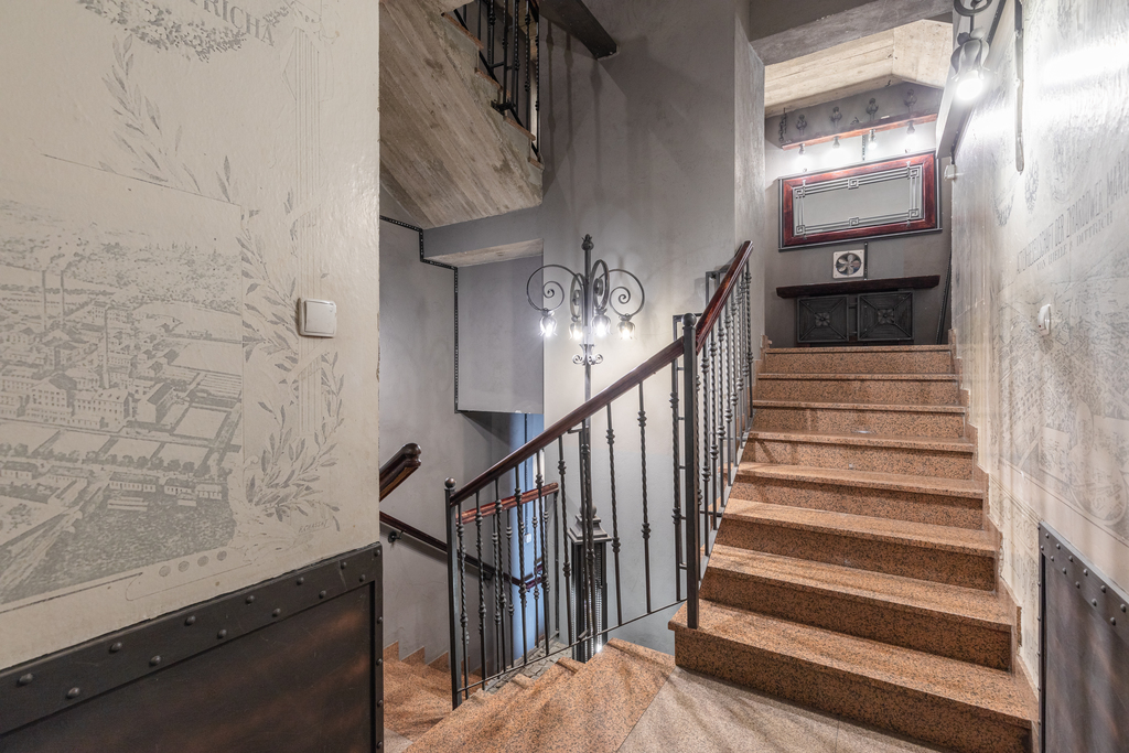 370 cm. Klatka schodowa wykończona w klimatach dawnego fabrycznego Żyrardowa, nawiązuje do historii tego miejsca.