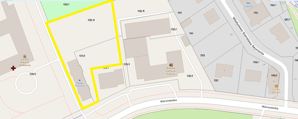 Na sprzedaż nieruchomość położona przy ul. Warszawskiej 15 w Białej Podlaskiej, obejmująca dwie działki o łącznej powierzchni 2939 m² (numery ewidencyjne 1330/14 i 1331/2).
