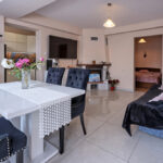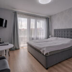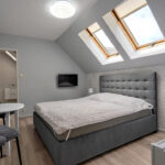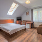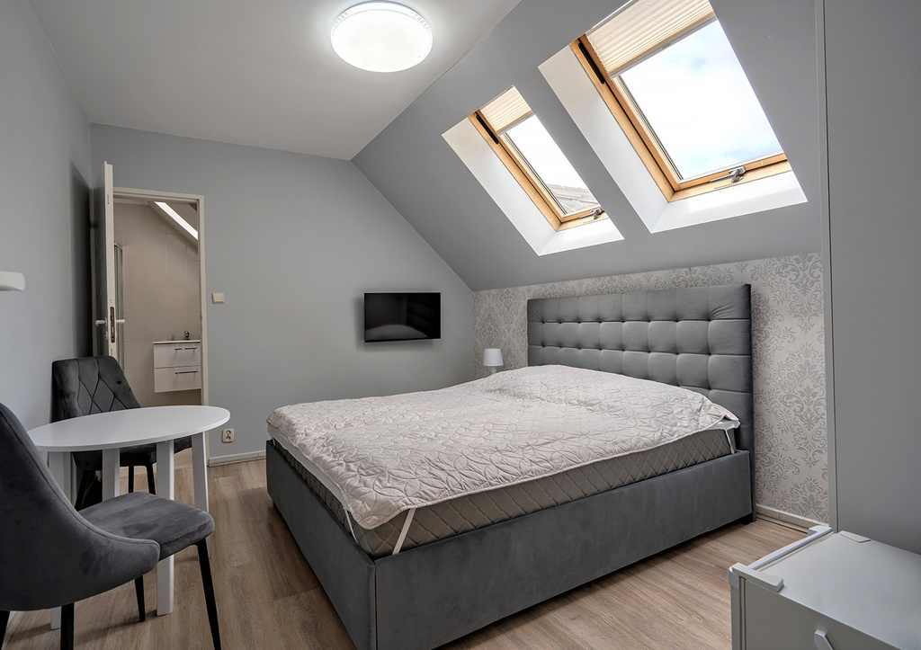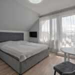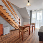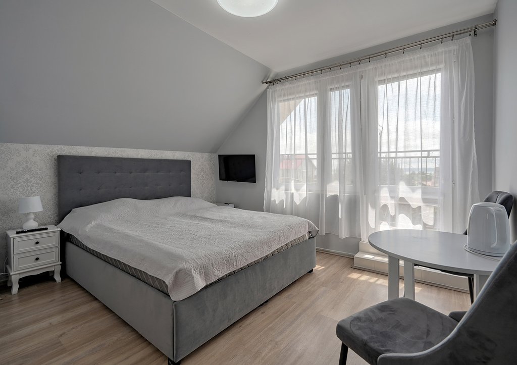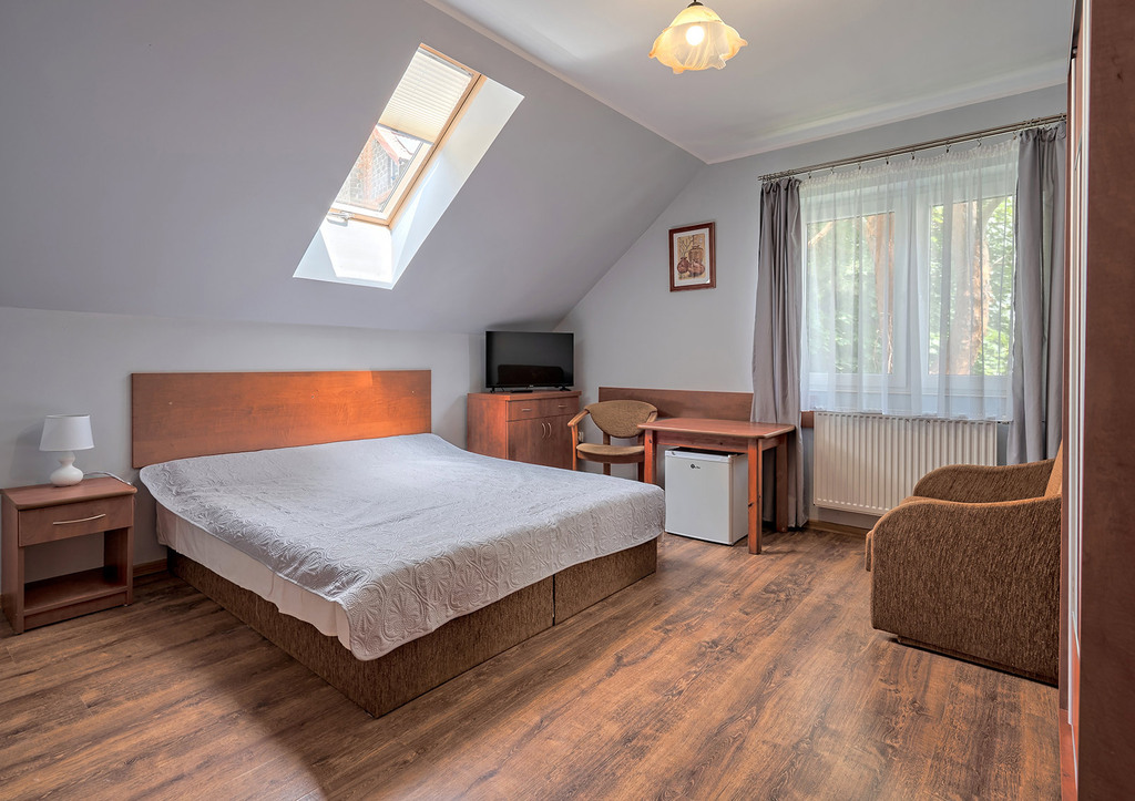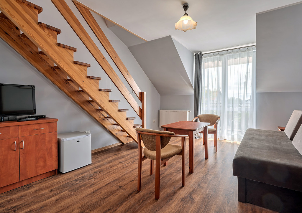 - w obu budynkach znajduje się łącznie 17 przestronnych pokoi dla gości (łącznie 41 miejsc noclegowych), w tym 2 pokoje typu studio (dwupoziomowe), większa część pokoi (12) posiada balkon. Każdy pokój posiada własną łazienkę. Wszystkie pokoje wyposażone są w łózka małżeńskie lub tapczany, szafę na ubrania, stolik, foteliki, lodówki, TV