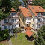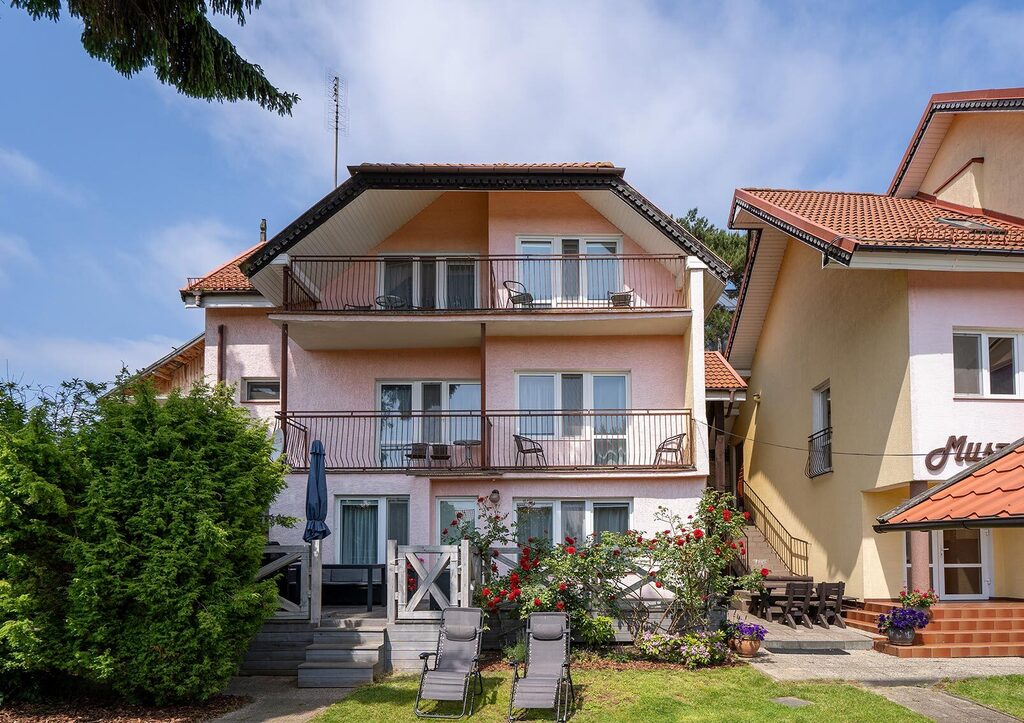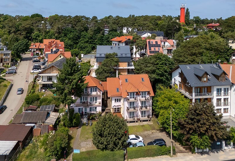 LOKALIZACJA: Pensjonat położony jest w Krynicy Morskiej przy głównej ulicy Gdańskiej, na 2 działkach o łącznej powierzchni 750 m2. Nieruchomość składa się z dwóch trzykondygnacyjnych budynków połączonych zewnętrznymi schodami