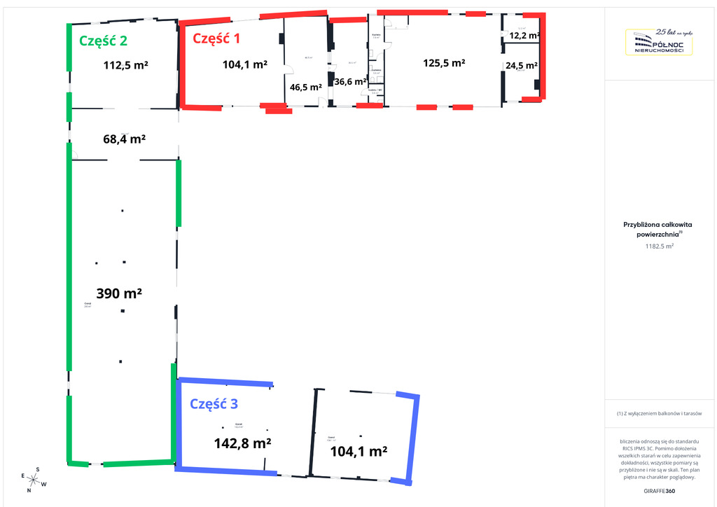 1349 m², natomiast rzeczywista powierzchnia całkowita według pomiaru wynosi ok.