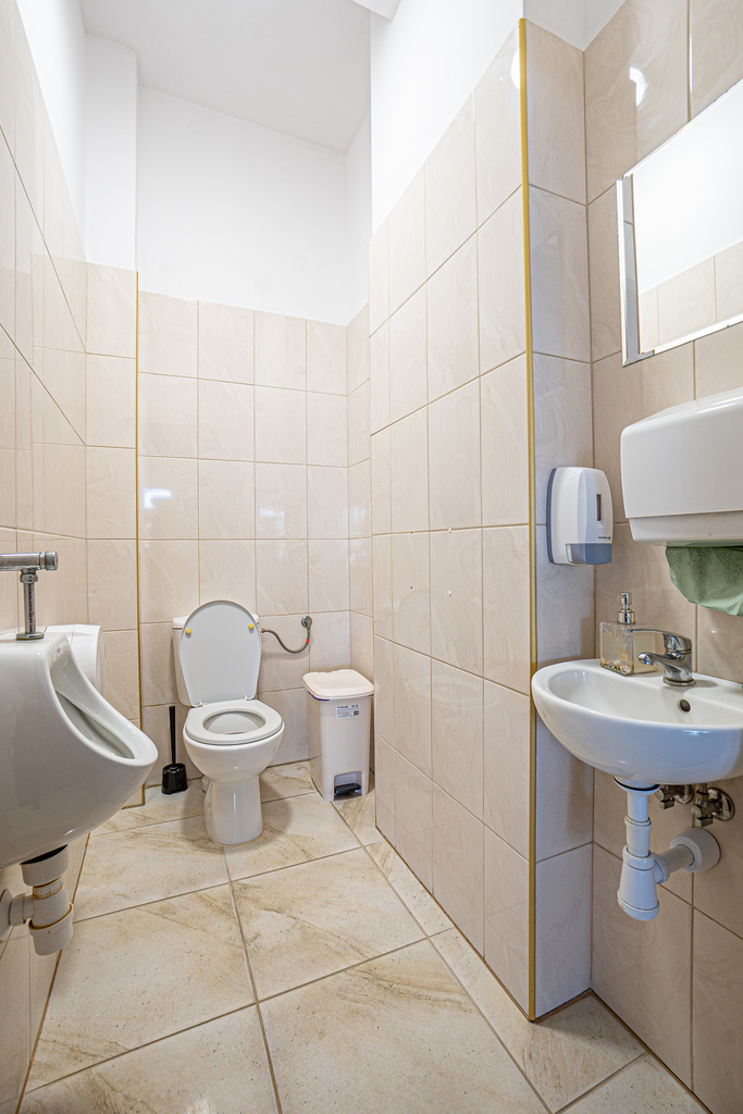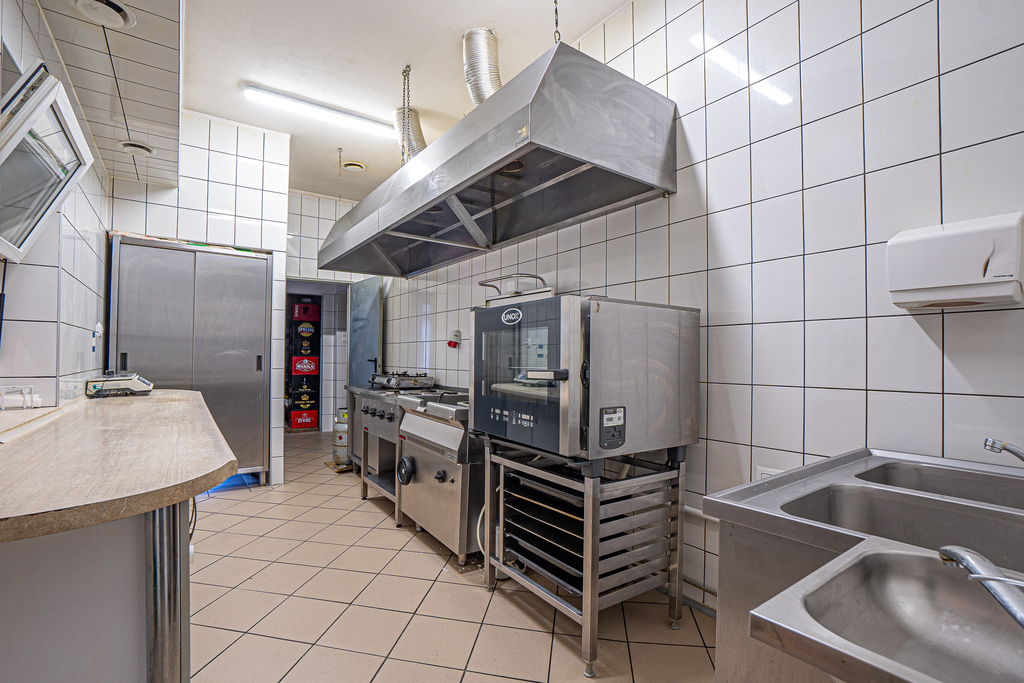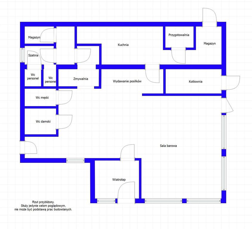 - kompletny układ funkcjonalny (kuchnia, przygotowalnia, zmywalnia, miejsce na wydawanie posiłków, magazyny, toalety i ogromna sala barowa).