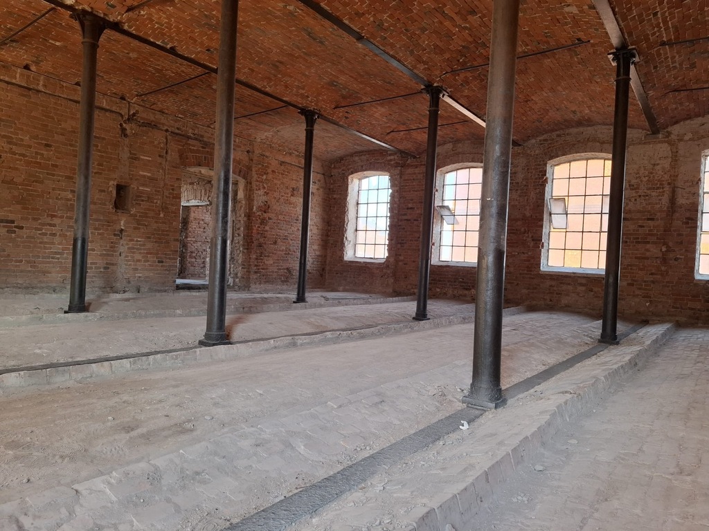 - Zachowane elementy konstrukcji stalowej oraz historyczna cegła